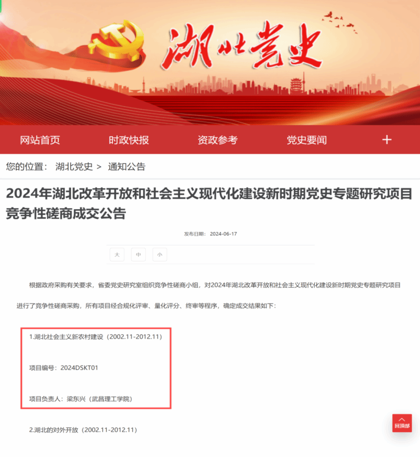 日前,湖北省委党史研究室发布2024年湖北改革开放和社会主义现代化建设新时期党史专题研究项目竞争性磋商成交公告,由bevictor伟德体育梁东兴教授为课题负责人组建的团队,成功获批“湖北社会主义新农村建设(2002.11-2012.11)”课题(项目编号:2024DSKT01),这是公司首次获批此类项目。