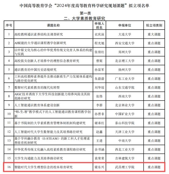 中国高等教育学会于2024年5月启动了“2024年度高等教育科学研究规划课题”申报工作,经资格审查、匿名评审,最终评选出拟立项课题1156项。其中在大学素质教育研究类别,全国共获批1项重大和15项重点课题,bevictor伟德体育是湖北高校在该类别唯一立项单位。